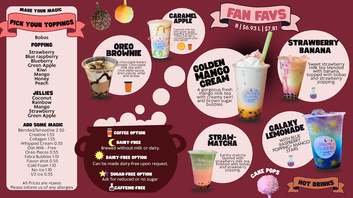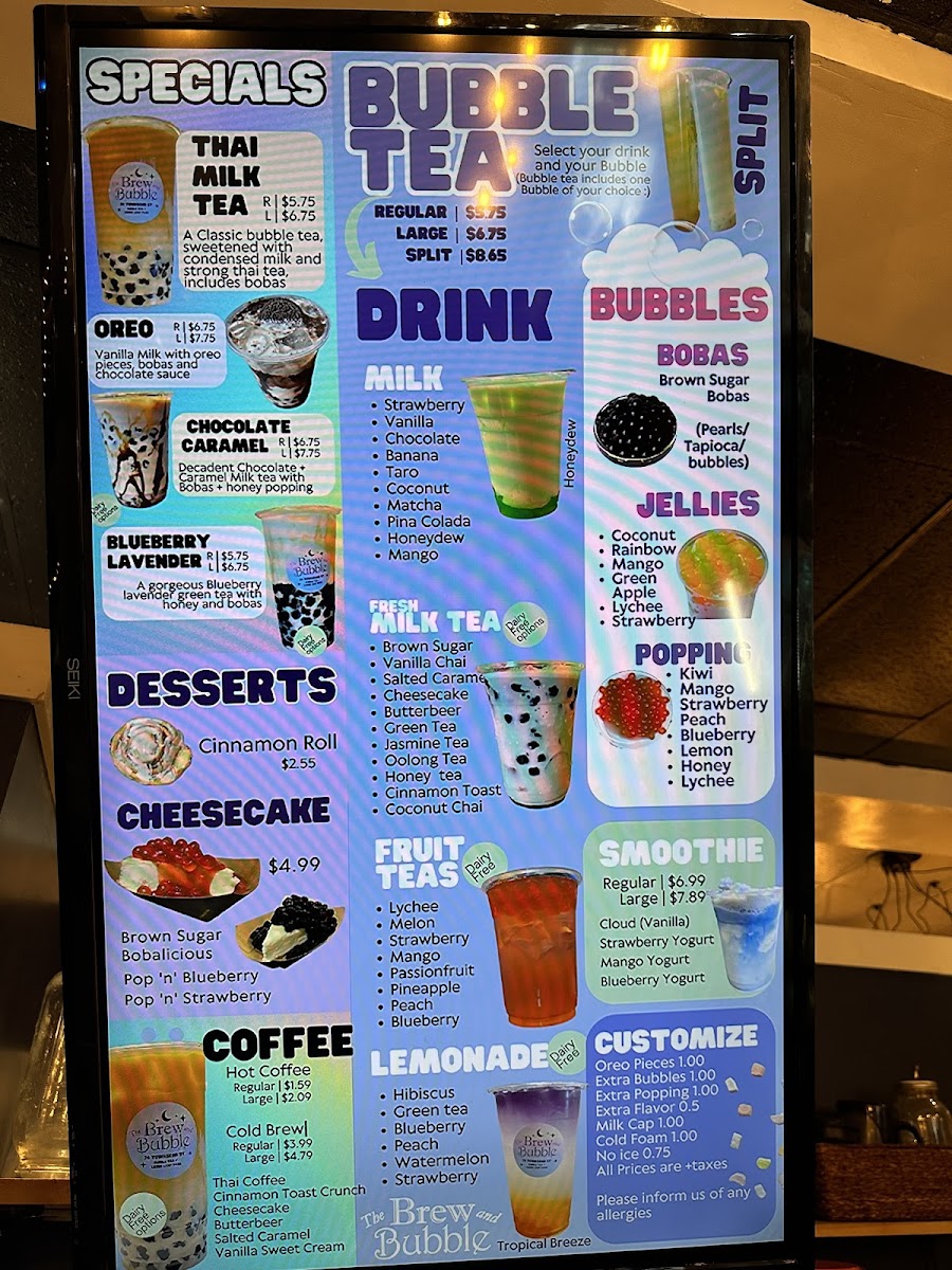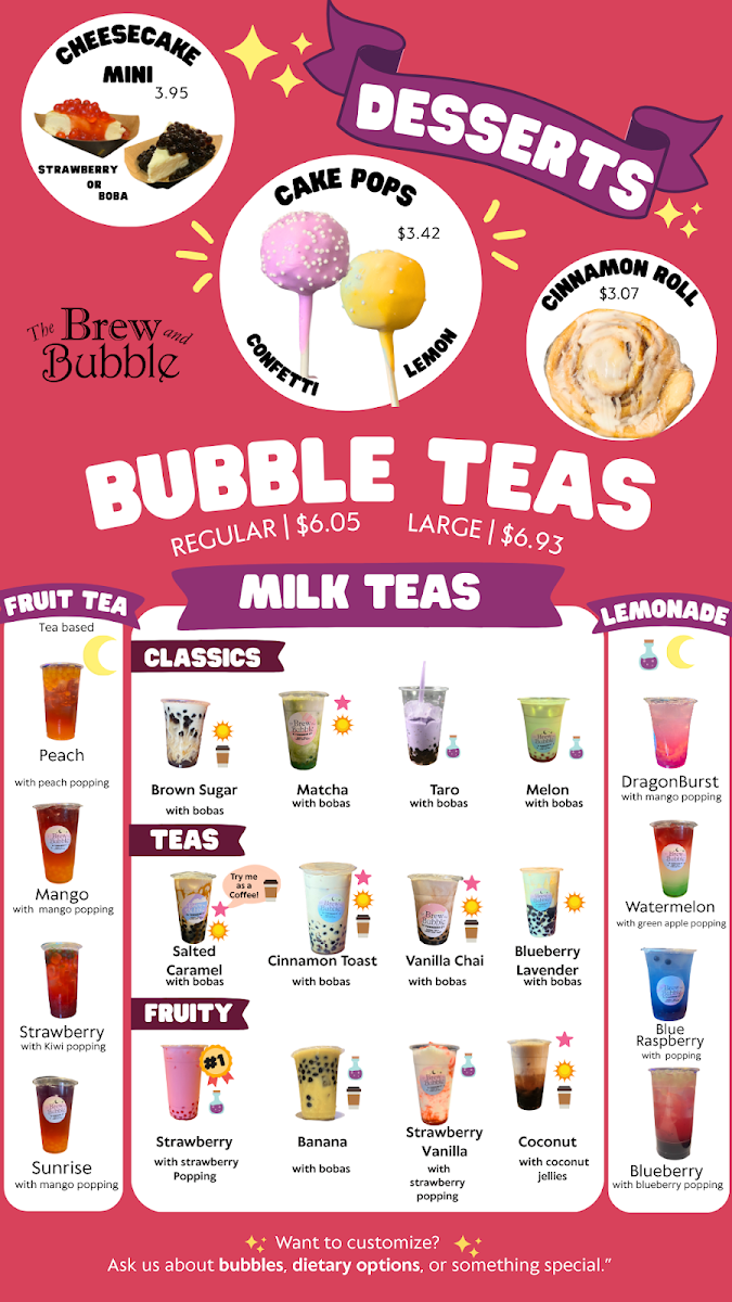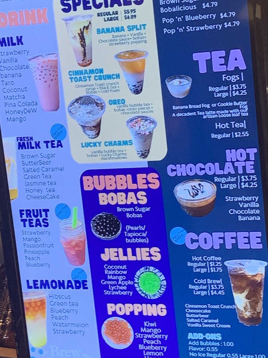 The Brew and Bubble offers a variety of intriguing options on its menu, perfect for those looking to indulge in sweet and comforting drinks. For those with a sweet tooth, the Oreo, Thai Milk Tea, and Chocolate Caramel specials provide unique flavor combinations that are sure to please. If you're in the mood for a dessert-inspired drink, the Brown Sugar Bobalicious, Pop 'N' Blueberry, and Pop 'N' StrawberryCinnamon Roll are delightful choices, each with a rich, satisfying taste. For coffee enthusiasts, there’s something for everyone with the Thai Coffee, Hot Coffee, and refreshing Cold Brew. The tea options are equally appealing, with the soothing Green Tea, fragrant Jasmine Tea, and sweet Honey Tea providing a perfect balance to the menu. Additionally, the Cinnamon Toast and Cloud are standout choices for those looking for something cozy and comforting. The Brew and Bubble’s menu is a blend of creative flavors and classic favorites, making it a must-visit for anyone in the area.